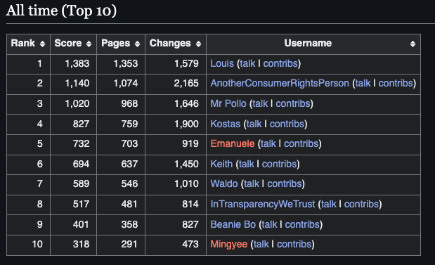 A special shoutout as well to the top contributors of the year (not named Louis Rossmann). Despite Bythmusters' remarkable assault on the top contributors leaderboard over the last month, AnotherConsumerRightsPerson takes the cake with a remarkable 2,165 changes across 1,074 pages. Mr Pollo, a fantastic mod who's been with us from the very start, is comfortably in the #2 spot.